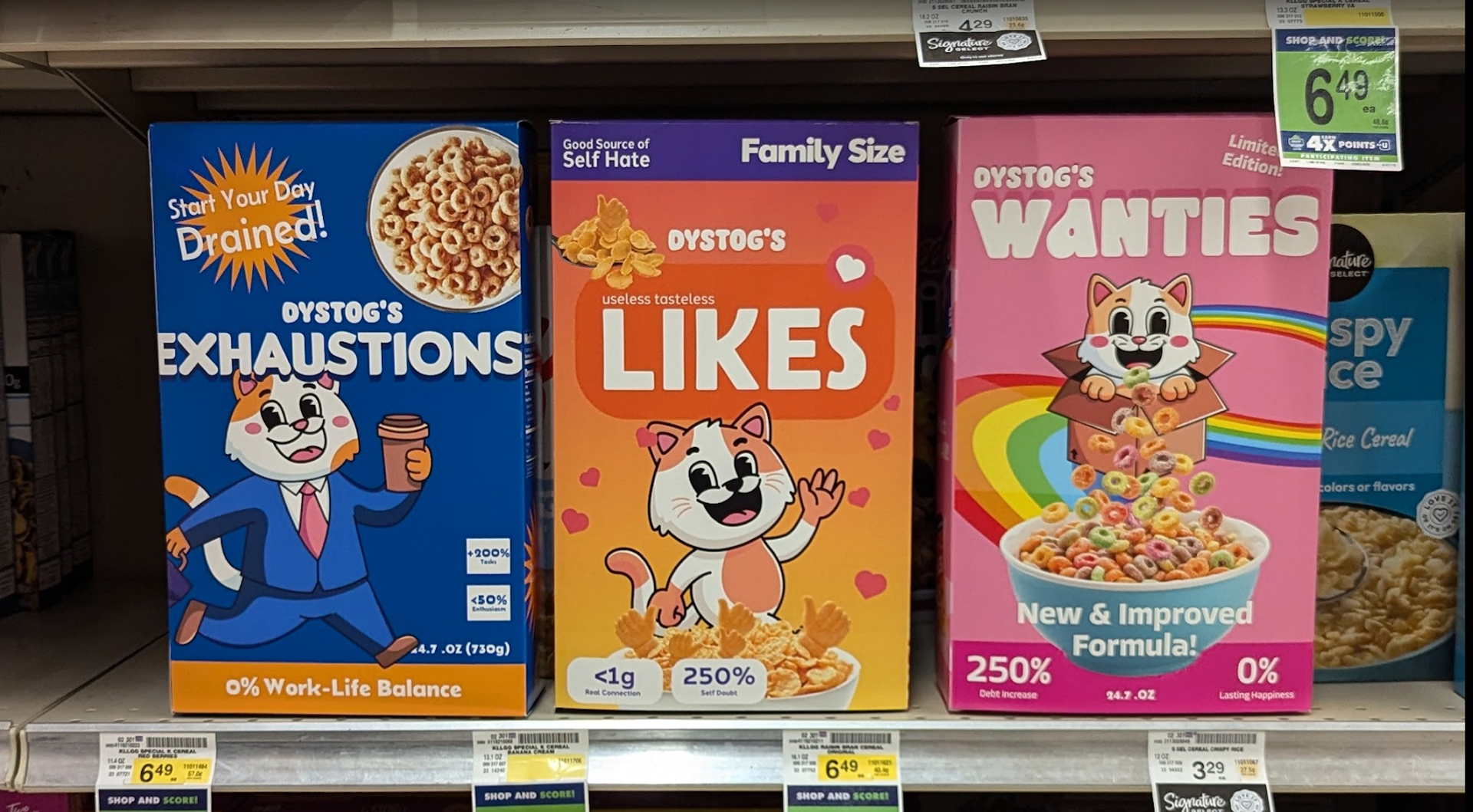 Mundane Dystopia is a three-part cereal box art series exploring the everyday dystopias we sleepwalk into. I identified three disturbingly normalized aspects of modern life, our most casual nightmares, and I wrapped them in the friendliest, most familiar format I could think of: cereal. Each box features a warped version of the same cat (cats are the most dystopian animal out there)