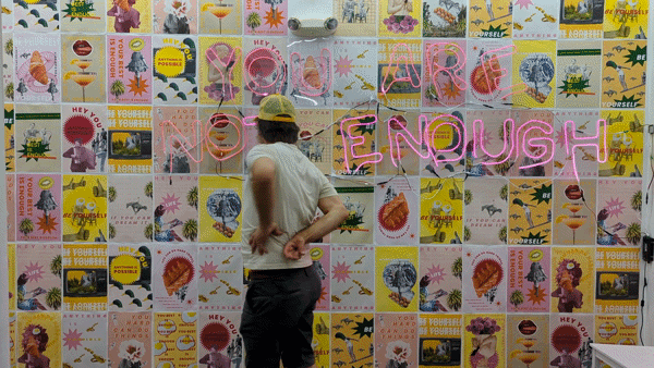 Above them, a glowing neon sign reads: You Are Not Enough.